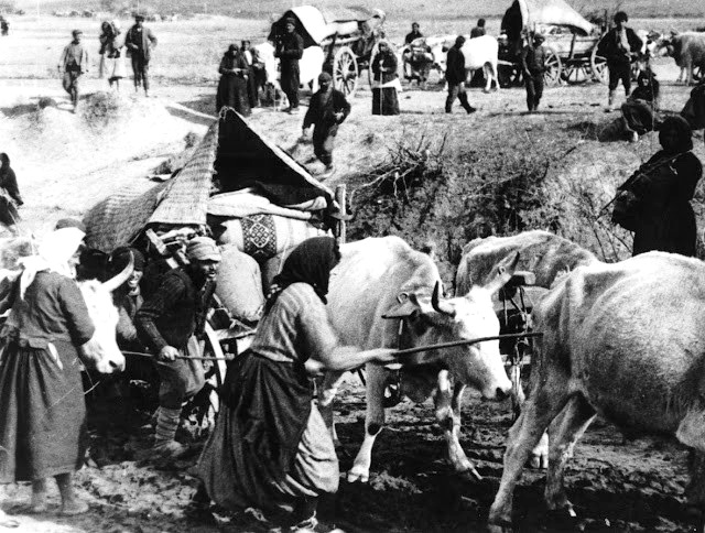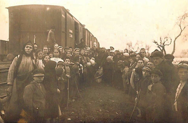 Στην παραπάνω φωτογραφία, διανομή άρτου σε καταυλισμό στα τρένα στην Αλεξανδρούπολη. Οι εικονιζόμενοι είναι πρόσφυγες από τη Χηλή της Μαύρης Θάλασσας (Πηγή: ΓΑΚ Έβρου).