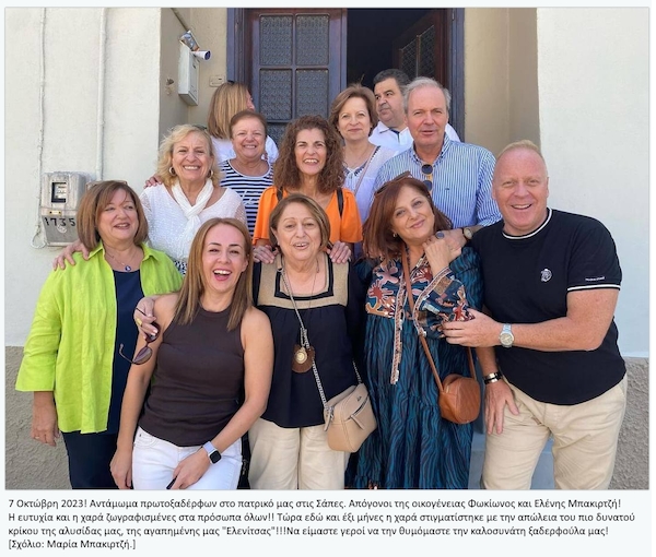 Μια όμορφη ενέργεια των συγγενών απογόνων του Φωκίωνα Μπακιρτζή. Και είναι η πρώτη ενέργεια που δημοσιεύω αυτού του είδους! Μετά από 101 χρόνια οι απόγονοι της οικογένειας επισκέφθηκαν στις Σάπες την κατοικία των προγόνων τους, που ακόμη βρίσκεται σχεδόν ίδια. Συντηρημένη βέβαια, αλλά με τη μορφή που είχε από τότε, το 1924!
